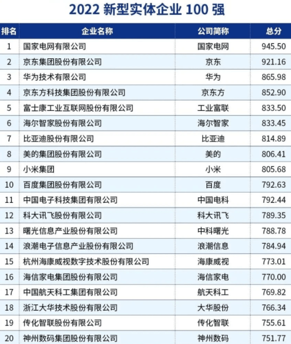 在11月27日举办的中国企业家博鳌论坛“中国式现代化下的新型实体企业发展之路”研讨会上,2022新型实体企业100强榜单出炉,国家电网、京东、华为位居前三。在2022新型实体企业100强中,有32家企业进入了2021年《财富》世界500强排行榜,有45家企业进入了2021年中国企业500强排行榜。具体来看,国家电网以945.50的高分夺得冠...