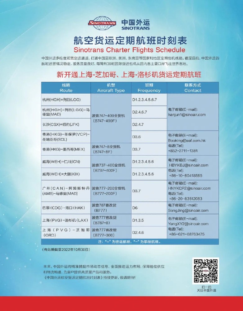 中国外运多维度拓宽空运通道,打通中国至欧洲、美洲、东南亚等国家和地区定期包机线路。截至目前,中国外运的航班运营情况稳定,服务质量良好,每周有39班国际货运包机从国内各主要口岸飞往世界各地。...