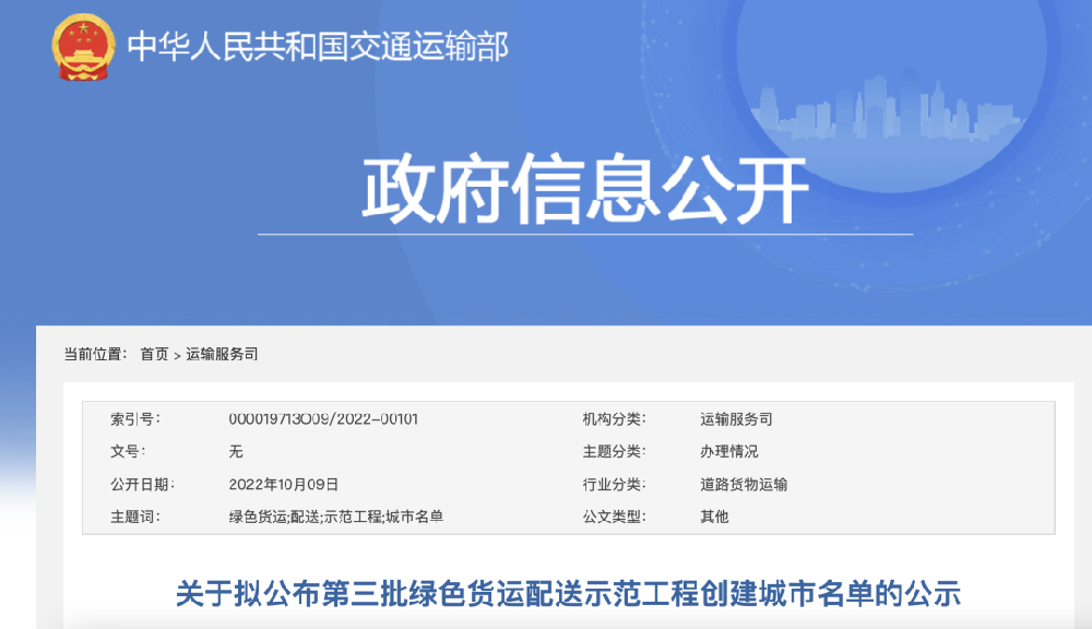 10月9日,交通运输部官网发布了《关于拟公布第三批绿色货运配送示范工程创建城市名单的公示》(以下简称《公示》)。据悉,按照《交通运输部办公厅 公安部办公厅 商务部办公厅关于组织开展第三批城市绿色货运配送示范工程申报工作的通知》(交办运函〔2021〕2122号)、《交通运输部 公安部 商务部关于印发〈城市绿色货运配...