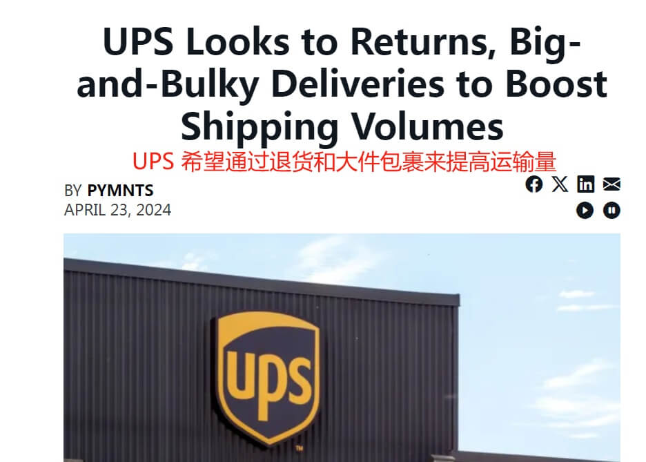 一、业务重心转移在全球跨境电商飞速发展的今天,物流行业正面临着前所未有的机遇与挑战,巨头们纷纷想方设法寻求更多的市场份额。日前,美国联合包裹服务公司(UPS)宣布,计划将业务重心转向退货和大件货物递送服务,以进一步扩大其潜在市场。UPS转变业务重心 图源:Pymnts正如UPS首席执行官Carol B.Tomé表示的那样:“国...