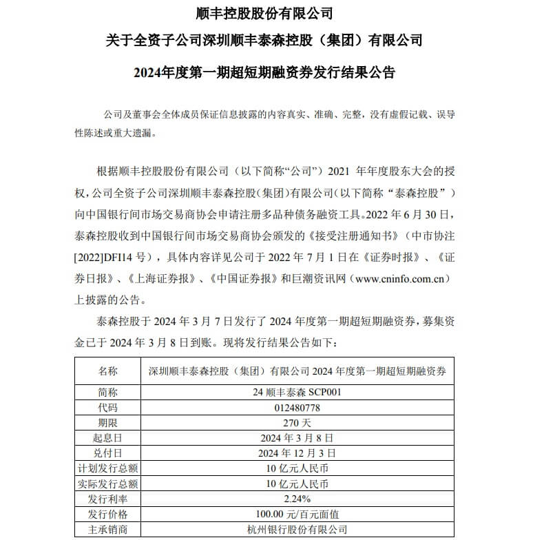 顺丰控股股份有限公司(以下简称“公司”)披露全资子公司深圳顺丰泰森控股(集团)有限公司2024年度第一期超短期融资券发行结果。公告显示,根据顺丰控股2021年年度股东大会的授权,公司全资子公司深圳顺丰泰森控股(集团)有限公司(以下简称“泰森控股”)向中国银行间市场交易商协会申请注册多品种债务融资工具。2022年...
