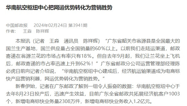 据中国邮政报,华南航空枢纽中心于去年8月23日投产后,迅速产生效益,目前广东全省邮政共拓展经济航客户1003个,新增电商标快业务量2308万件,新增电商标快业务收入1.2亿元。据了解,在华南航空枢纽中心建成前,广东邮政航空邮件缺少自营的空侧发运场地,依赖公共平台交运邮件,在交运速度、质量保障和与机场、航司合作黏性...
