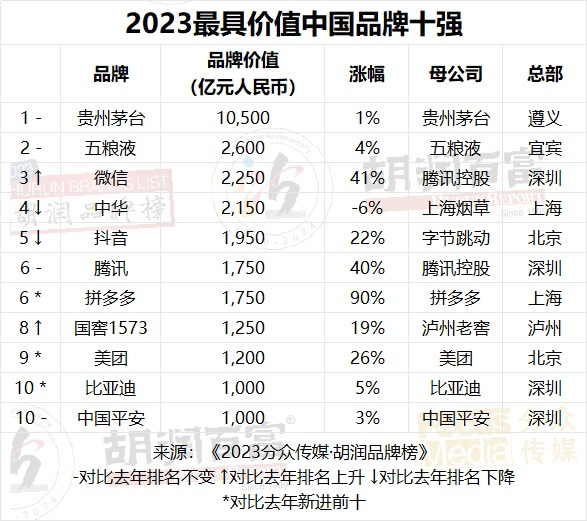 胡润研究院日前发布《2023分众传媒·胡润品牌榜》,300强最具价值中国品牌上榜。榜单显示,贵州茅台、五粮液、微信、抖音、拼多多位列前五。快递领域,共有10家品牌上榜。其中,顺丰以595亿元的品牌价值位列第26名,菜鸟以370亿元的品牌价值位列第40名,中通以235亿元的品牌价值位列第53名,京东物流以120亿元的品牌价值位列...
