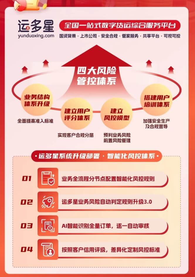怡亚通宣布旗下全国一站式网络货运服务共享平台“运多星”2024年数字化风控体系全面升级。在四大风险管控体系中,业务结构进行了体系升级,全面提高准入标准;建立了用户评分体系,实现客户合规分层;建立了风控模型,预判业务风险,前置风险管理;搭建了用户培训体系,加强安全生产及合规宣导。此外,运多星系统升级部署,...