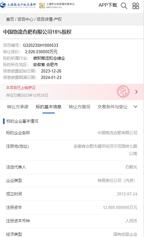 据上海联合产权交易所,中国物流合肥有限公司15%股权被挂牌转让,转让底价2026.03万元。转让方为马钢集团物流有限公司。图源:上海联合产权交易所官网天眼查资料显示,中国物流合肥有限公司成立时间为2012年7月24日,注册资本1.2亿元,经营范围含港口经营;水路普通货物运输;道路货物运输(不含危险货物);道路货物运输(...