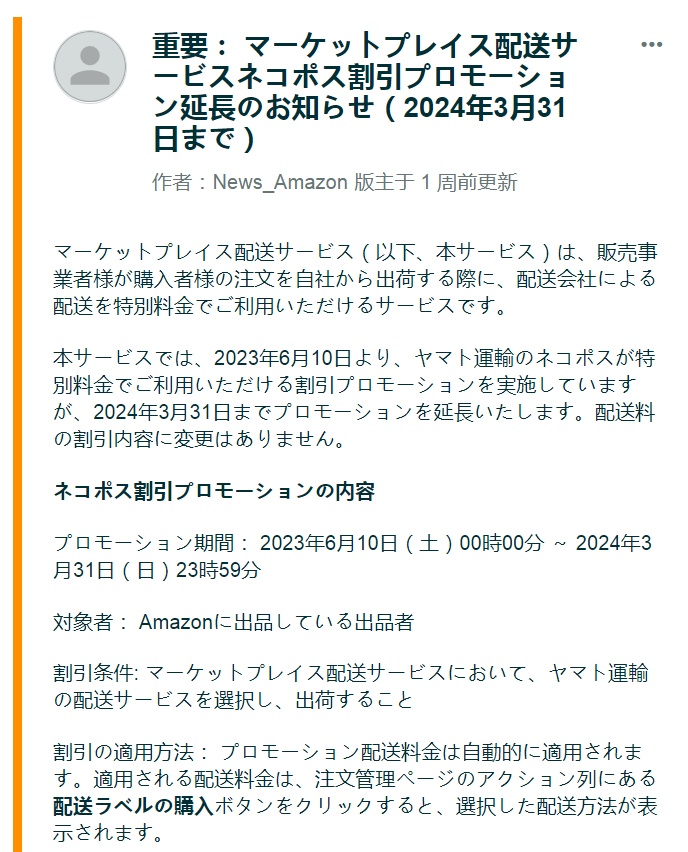 亚马逊日本站近日发布公告称,将Nekopos市场配送服务的折扣促销延长至2024年3月31日。据了解,市场配送服务(以下简称“服务”)是一种允许卖家在配送买家订单时以优惠价格使用配送公司的服务。对于这项服务,亚马逊正在进行折扣促销,自2023年6月10日起,卖家可以以特价使用大和运输的Nekoposu。目前,平台将促销活动延长至...