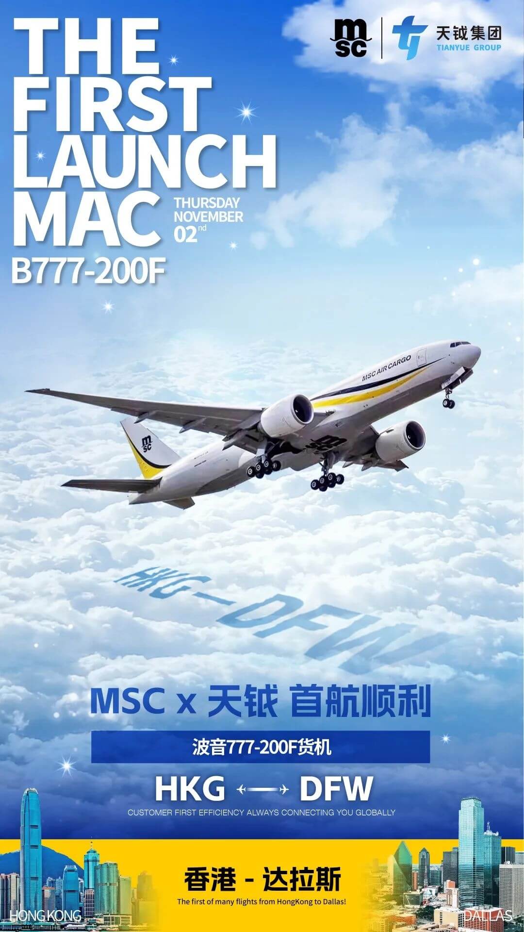 MSC地中海航运(简称:MSC)在亚太地区的首条商业定期航空货运航线HKG-DFW(香港-达拉斯)于11月2日首航成功。为满足市场需求,MSC开通HKG-DFW(香港-达拉斯)航线,定期航班连接中国与美国。达拉斯市位于德克萨斯州北部地区,是美国南部最大都市区的主要核心,也是美国最大的内陆都市区。MSC空运业务持续推进,并继续...