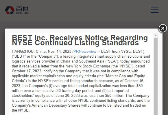 百世集团昨日表示,公司于10月17日收到了纽约证券交易所的通知,通知公司不符合纽约证券交易所继续上市标准中适用的市值和股本标准,因为截至2023年10月16日,公司连续30个交易日的平均总市值低于5000万美元,并且截至2023年6月30日最后一次报告的股东权益低于5000万美元。百世目前符合纽约证券交易所继续上市的所有其他标准...