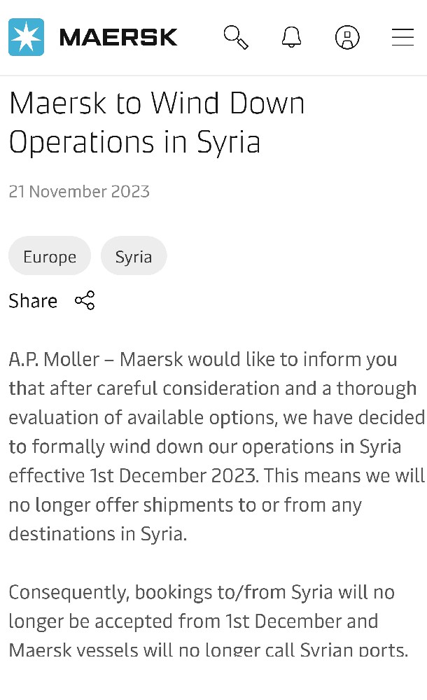 马士基发布声明称,经过慎重考虑和对可用方案的全面评估,决定从12月1日起正式结束叙利亚业务,届时将不再接受往返叙利亚的订舱,马士基船舶也将不再停靠叙利亚港口。马士基表示,受高度制裁影响,叙利亚的商业活动已受到很大限制,马士基在该国开展的业务非常有限。马士基会履行其现有的承诺,确保为所有往返叙利亚且已分配...
