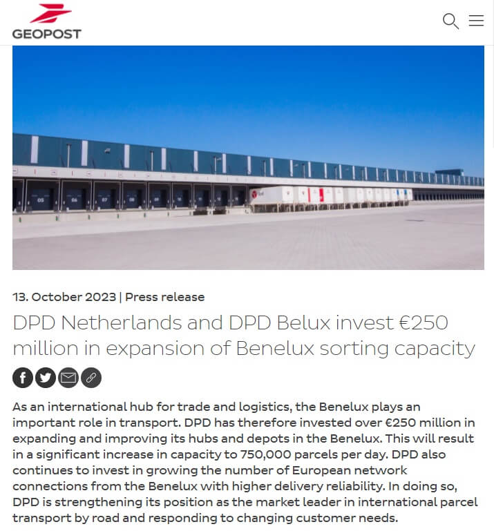 DPD投资2.5亿欧元扩建和改造比荷卢经济联盟的物流中心。扩建改造后,比荷卢经济联盟的物流中心每天可以处理75万个包裹。DPD在比荷卢经济联盟中有三个收集和分拣包裹的物流中心,分别位于埃因霍温、维嫩达尔和布鲁塞尔。尽管位于埃因霍温和布鲁塞尔的中心最近才开业,并且位于维嫩达尔的中心今年已经完全现代化,但DPD仍然在...