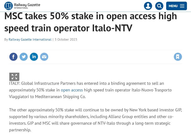 据悉,班轮运输公司地中海航运MSC最近收购了两家铁路运营商——意大利铁路运营商Italo和西班牙铁路运营商Renfe。MSC在10月2日表示,已经签署了一份具有约束力的协议,收购GIP旗下的意大利铁路运营商Italo 50%的股份。Italo运营高铁客运市场,是意大利第二大铁路运营商,仅次于国有的Ferrovie dello Stato。图注:MSC收购Ita...