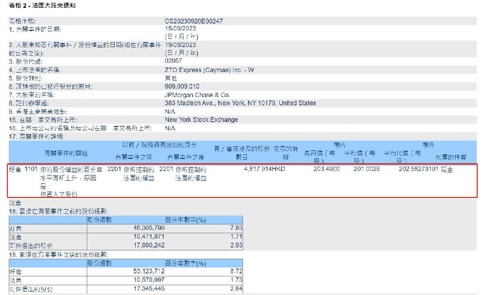 根据港交所最新权益披露资料显示,2023年9月15日,中通快递-SW获JPMorgan Chase& Co.以每股均价201.0029港元增持好仓481.79万股,涉资约9.68亿港元。增持后,JPMorgan Chase & Co.最新持好仓数目为5312.37万股,持好仓比例由7.93%上升至8.72%。截自港交所网站2023年上半年,中通快递收入187.24亿元,同比增长13.1%;...