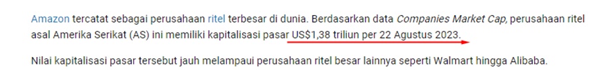 1.市值登顶亚马逊和沃尔玛再次相遇在榜首。近日,databoks(印尼经济商业数据中心)发布了一份世界零售公司市值排名。最新数据显示,亚马逊市值已突破1万亿美元,达到1.38万亿美元,排名第一。(亚马逊市值已达1.38万亿美元 图源:databoks)沃尔玛以4241.2亿美元的市值位居第二,老牌零售企业地位保持稳定。阿里巴巴排名第五...