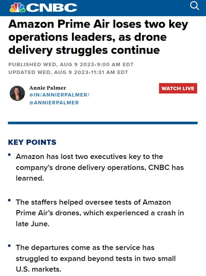 据媒体报道,LinkedIn个人资料显示,亚马逊Prime Air的首席飞行员吉姆·马林(Jim Mullin)已于上月离开亚马逊。与此同时,负责Prime Air所有测试业务的罗伯特·德雷尔(Robert Dreer)上周离职,前往电动垂直起降飞机初创公司Opener工作。在亚马逊任职期间,罗伯特·德雷尔向吉姆·马林汇报工作。两位高管此前都在Prime Air位于...